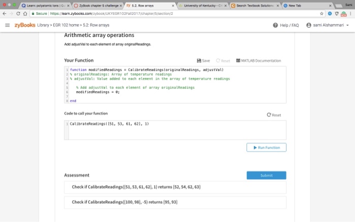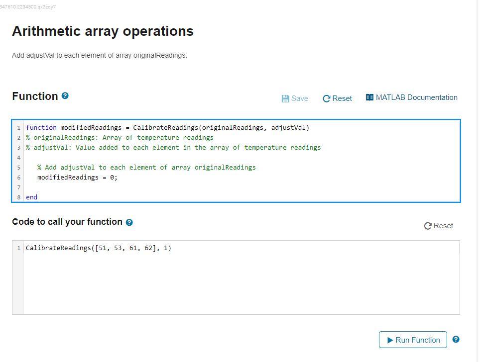 Array of temperature readings 31 adjustval. C Array Exercises Home Next. Your Function Save C Reset MATLAB Documentation 1 function modifiedReadings-CalibrateReadings originalReadings adjustVal 2 original Readings.